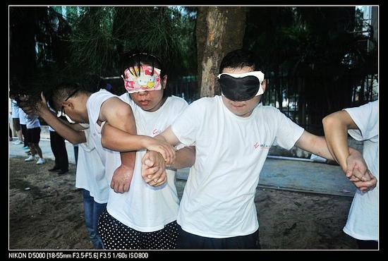 教练叫我们分成4对,然后教练每人发了一张纸巾和一个眼罩,让我们蒙上眼睛,双手互相握着左右的同事的手,无论路上遇到什么困难都不能松开,不能说话,要相信对方可以安全的带领着你走下去。