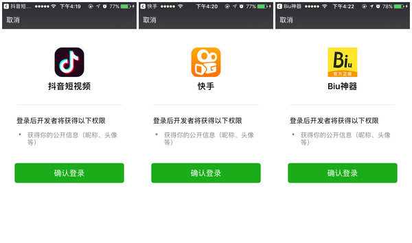 拍“桌”说法,为您解答:在第三方应用或页面登录时,下方多会出现快捷登录界面,可能您为了方便直接选择微信或QQ等快捷登录,但是在确认登录界面。却有一行小字显示,访问您的详细资料(必选),访问您的基本资料(必选),还有可能获得您的微博,淘宝等个人信息。