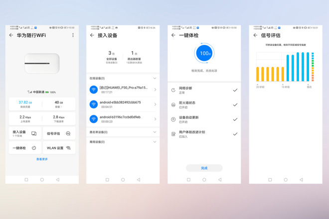 通过智慧生活APP可以绑定华为随行WiFi3进行相关设定,在APP里面可以查看接入设备详细信息、流量剩余情况、信号评估、设备电量等。