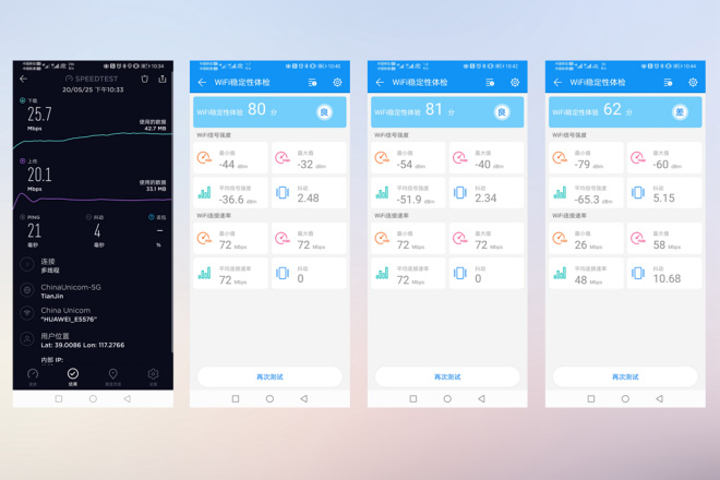 也实际的测试了一下设备的网速和稳定性,从测试结果中可以看到华为随行WiFi3的上传、下载速度都在20多Mbps,对于日常使用来说足够了;稳定性方面,三张图分别是距离WiFi设备1米、5米、一堵墙测试的,测试结果比较满意,信号波动比较小。