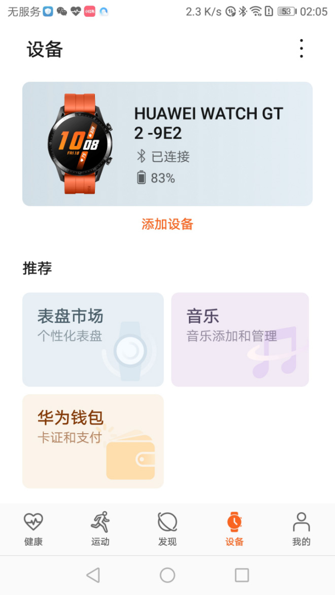 第一步:打开运动健康App,链接GT2。在下方设备菜单中,点击【华为钱包】。