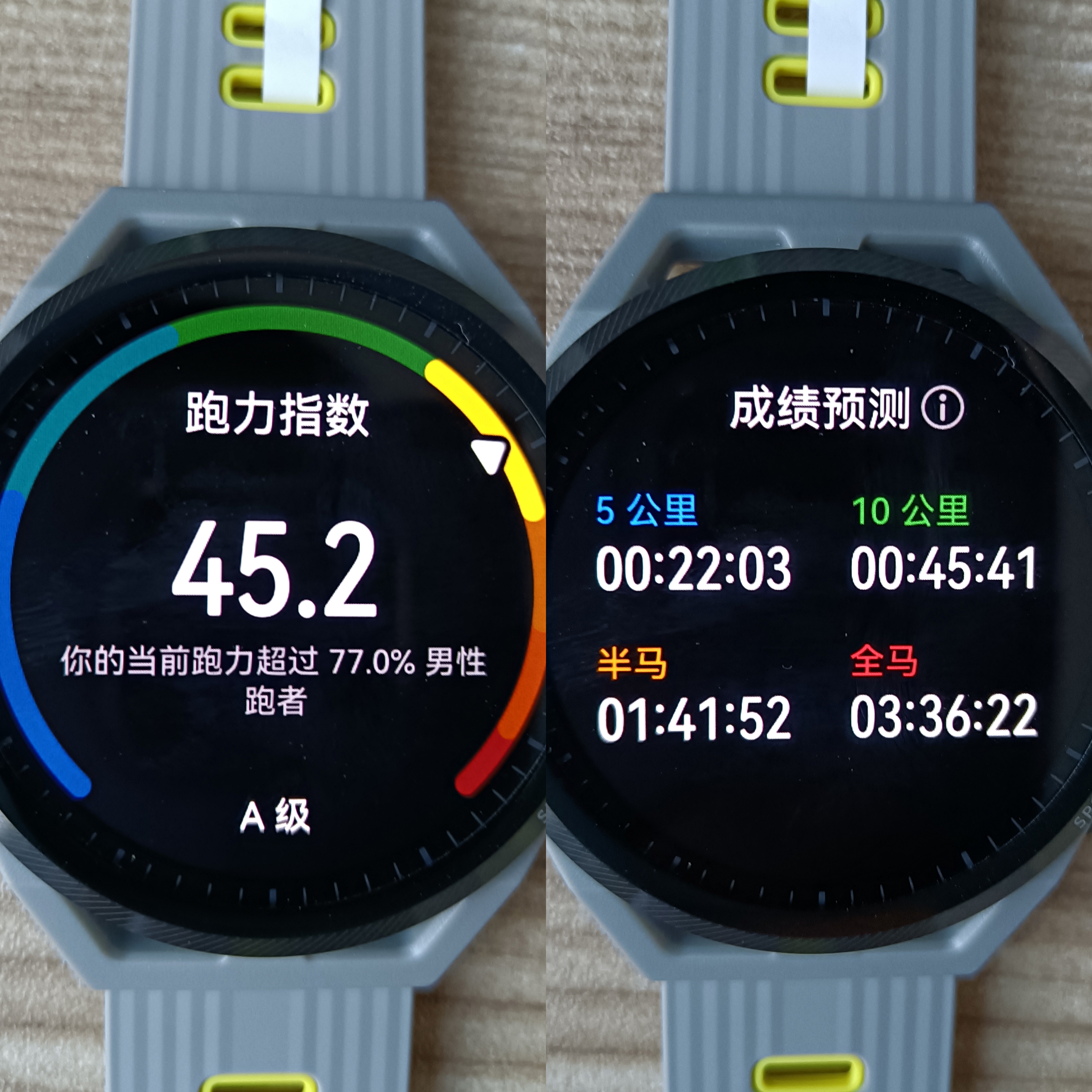 华为 WATCH GT Runner根据之前的各种运动能力分析给出了跑力指数为45.2,且全马成绩预测为336,看到数据后直接惊呆,因为PB成绩就是336,华为的实力YYDS!经过了解,这是华为运动健康实验室的成果之一,依据国家体育总局的运动标准,基于手表测出的身体最大摄氧量,结合每次跑步的心率、配速、距离、频次等多维度数据计算跑步成绩,测算跑力指数,精准为跑者跑步能力分级,方便用户实时掌握状况,直观感受自身跑步能力的进步。