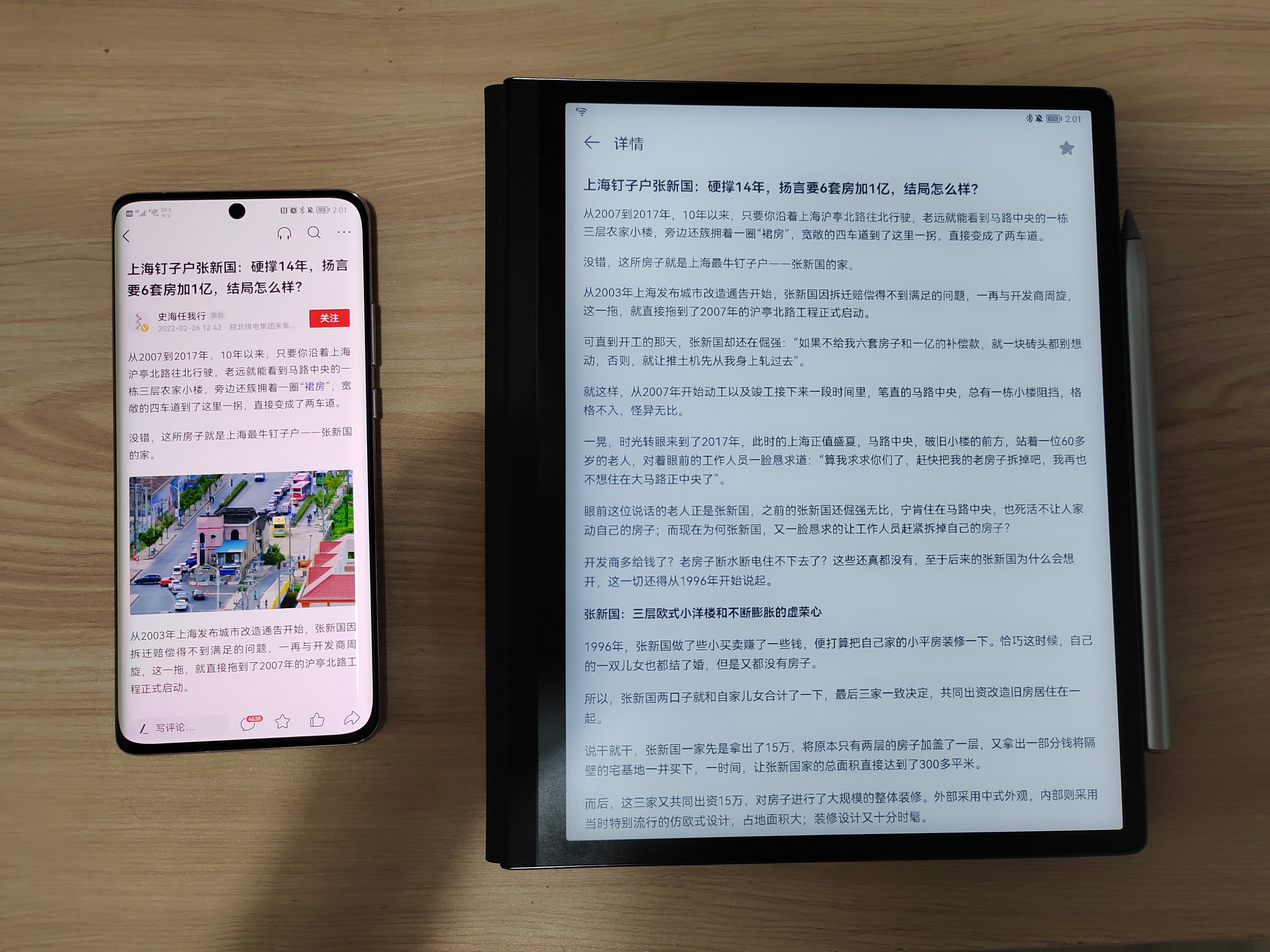 基于HarmonyOS特性,MatePad Paper支持超级终端,在手机上看新闻小说,可以在墨水屏接着看。