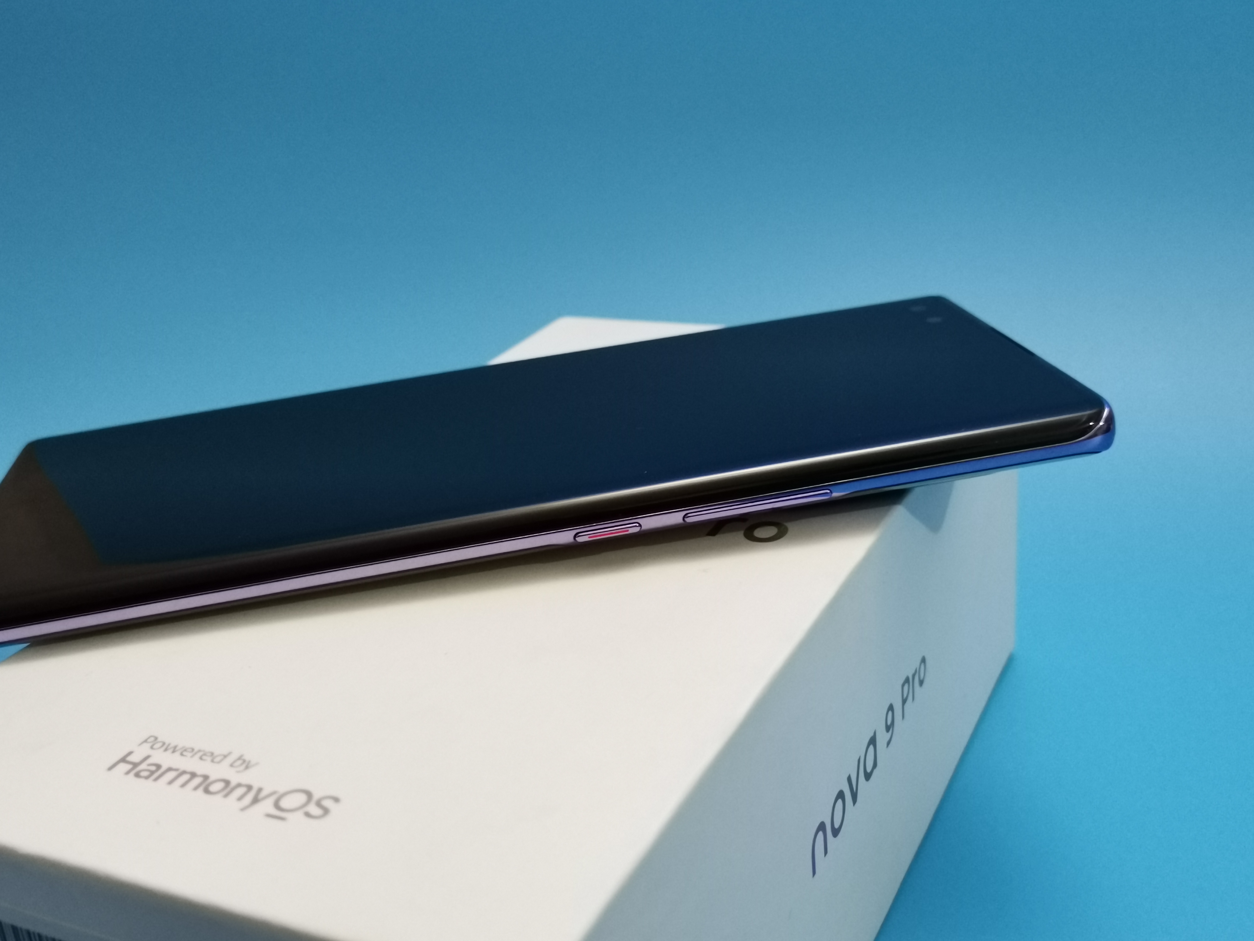 华为nova 9 Pro的电源按键和音量按键设置在了手机测右侧面,电源按键上还有一条红色线标,很有特色感。