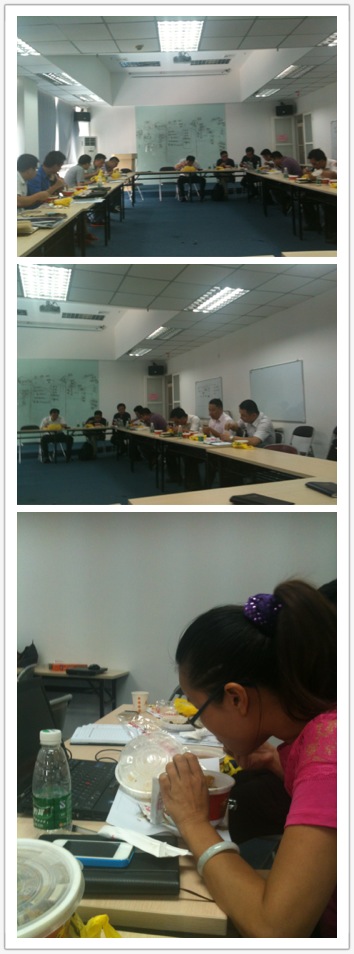 中午,仅吃饭用了半小时,其余时间全部在讨论!