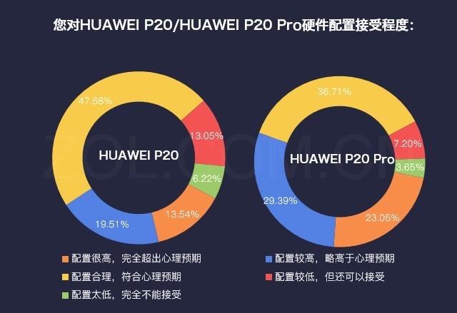 调查数据显示,对于HUAWEI P20,93.78%的用户表示能够接受其硬件配置。HUAWEI P20 Pro的用户对其硬件的评价要略高于P20,累计96.35%的用户表示接受其配置。其中近三成的用户认为HUAWEI P20 Pro配置较高,略高于心理预期,该比例较HUAWEI P20高近10个百分点。