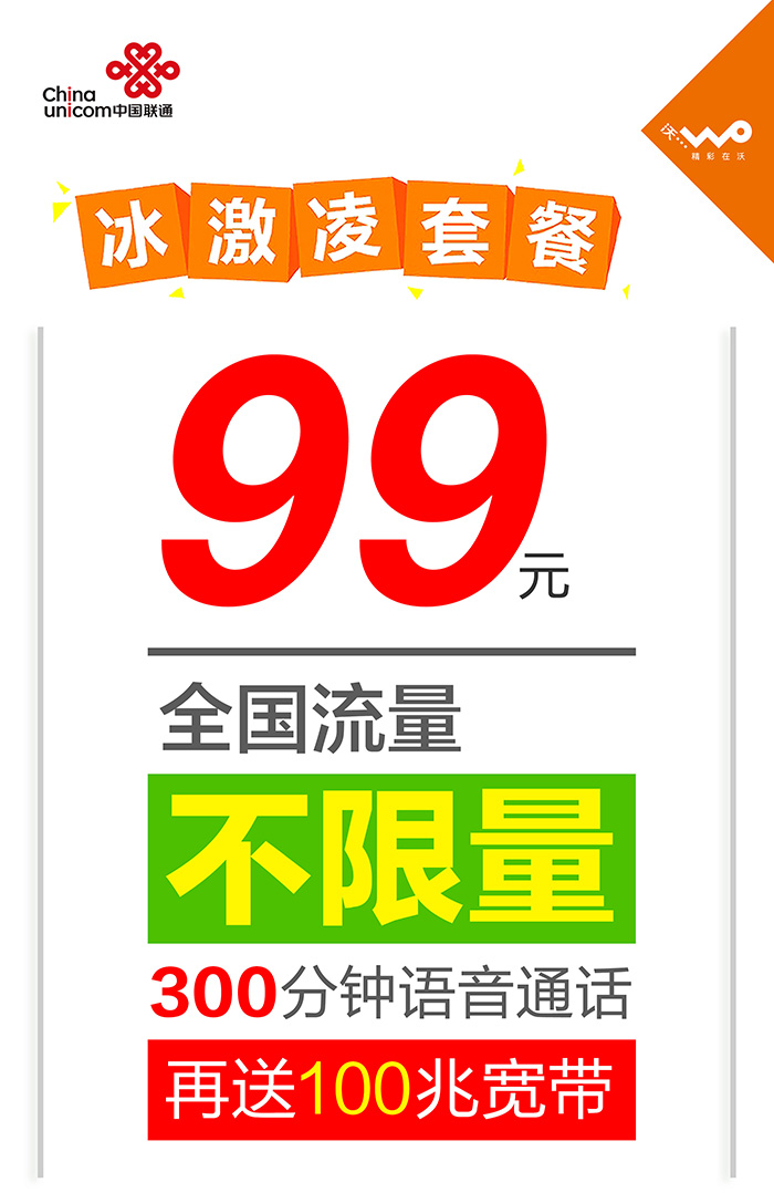此文关键字:冰缴,凌,套餐,99元,每月,300分钟,无限,流量,
