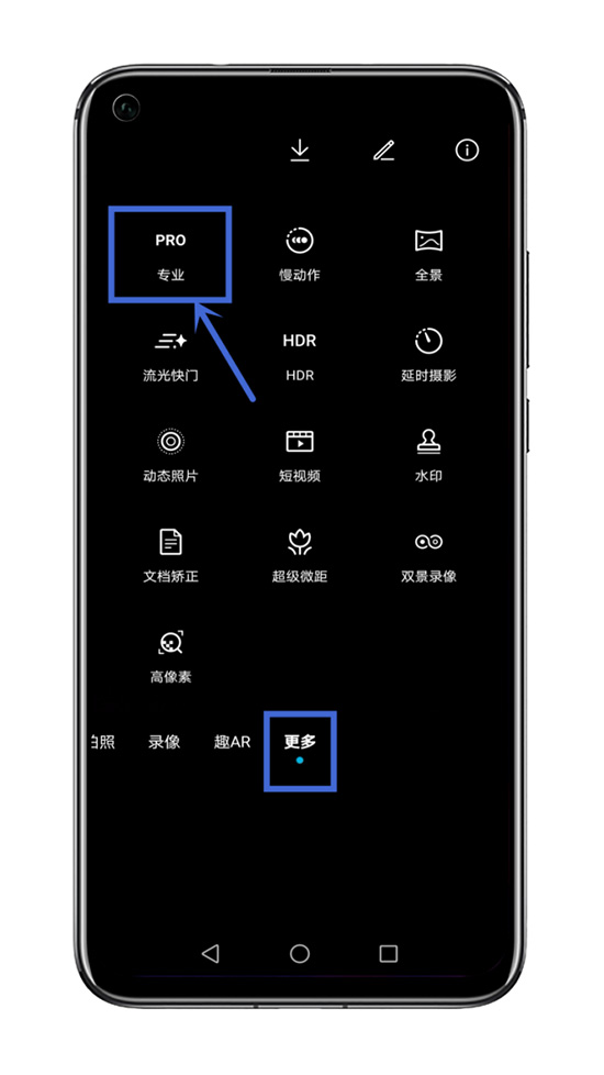 打开相机,向左滑动,滑到更多,可以看到一个‘专业PRO’