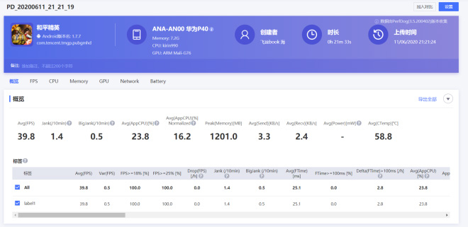 简单玩一局《和平精英》体验一番,游戏画质为超高清画质,帧率为高帧率模式。经过21分钟的测试,游戏帧率保持在39.8帧,波动为1.4帧,相对流畅的体验带来极致的游戏效果。测试过程中,CPU温度保持在58.8℃左右,属于正常温度范围。