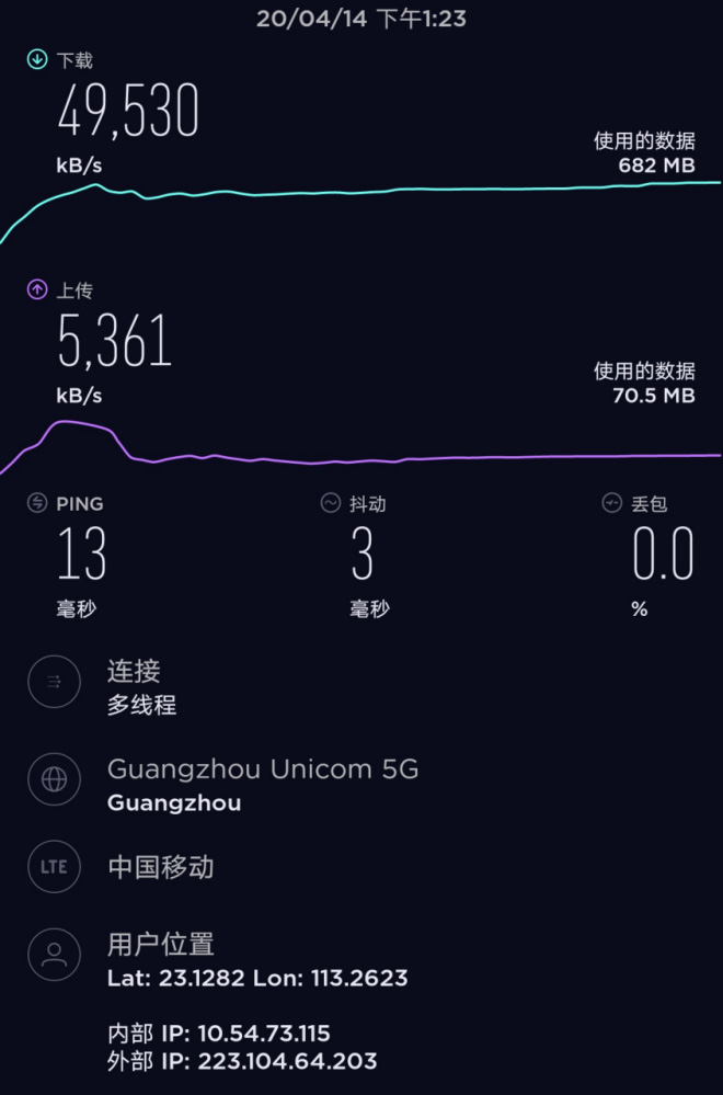 华为P40支持全国目前所有运营商5G频段,简单测试一下5G网络表现。在室外5G信号不错的地方进行测试,SpeedTest多线程模式得出的下行速率为Mbps,上行速率为Mbps
