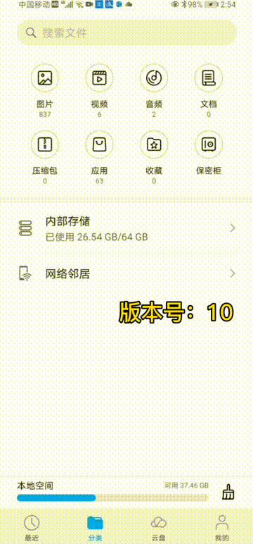 我们熟悉的文件管理器也有很大的改动,一个是UI界面上使用了更多图文交替的元素,比如图片,视频,文档等等。同时云盘也整合到了位置中~微信和下载等单独应用的文件也有单独分类,方便查找相应应用下载保存的文件~