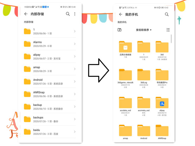 在详细的文件界面中,新版本在文件夹图标上也有创新,比如支付宝的根目录,就多了一个支付宝的图标。文字说明也更加清晰,比如应用分身数据~