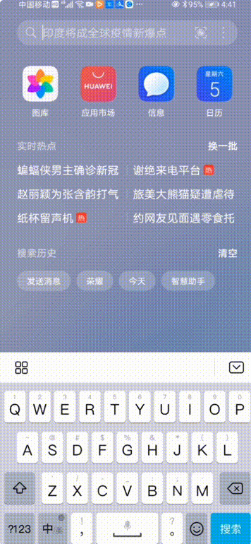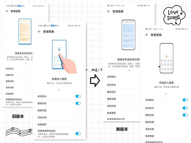 智慧搜索,就是我们常用的下滑手机首页出现的搜索栏~我们来看看旧版本和新版本的智慧搜索关于界面,可以看到新版本的智慧搜索在样例图标和功能上都有着不同程度的升级,新增了应用建议的功能~