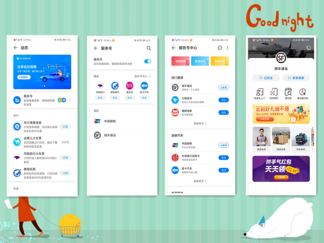 同时在订阅中新增了服务号选项,你可以单独订阅单个商家的服务号,如快递方面可以订阅SF快递,而无需在整合到旧版本负一屏自带的快递通知软件~或者可以订阅最新的电影票信息等等~