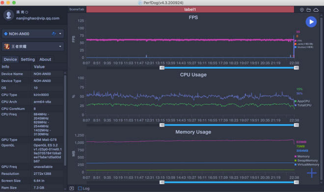 我还专门使用王者荣耀测试了游戏帧率,麒麟9000 5G芯片在游戏过程中全程高效运行,游戏的平均帧率维持在59帧,帧率曲线也十分稳定。此前我们也说过华为Mate40 Pro的屏幕是支持90Hz高刷新率和120Hz触控采样率的,所以在一些支持高帧率的游戏过程中体验是很流畅的,这个在普通屏幕的手机上是不能体验到的。